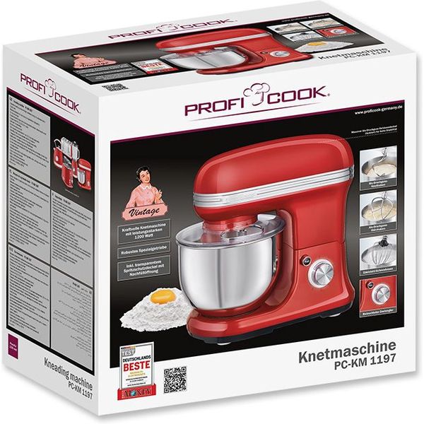 Η κουζινομηχανή Profi Cook PC-KM 1197 συνδυάζει vintage αισθητική σε κόκκινο χρώμα με ισχυρή απόδοση 1200W, προσφέροντας όλα όσα χρειάζεστε για εύκολη και αποδοτική προετοιμασία ζύμης και μειγμάτων. Ο μεγάλος ανοξείδωτος κάδος 5L μπορεί να δεχτεί μείγμα έως 3 κιλά, ενώ το αποσπώμενο διαφανές καπάκι προστατεύει από πιτσιλιές και διαρροές κατά τη χρήση. Διαθέτει τρία εξαρτήματα για κάθε ανάγκη: γάντζο ανάμειξης για ομοιόμορφα αποτελέσματα σε μεγάλες ποσότητες, γάντζο ζυμώματος για βαριές ζύμες και αυγοδάρτη από ανοξείδωτο ατσάλι για αφράτες μαρέγκες και ελαφριά μείγματα. Ο διακόπτης επιλογής 6 ταχυτήτων με παλμική λειτουργία και φωτισμό LED, σε συνδυασμό με το soft start, προσφέρουν απόλυτο έλεγχο και σταθερή ταχύτητα ακόμα και σε βαριές ζύμες. Η συσκευή διαθέτει βραχίονα που σηκώνεται κατά 35° για εύκολη αφαίρεση του κάδου και αλλαγή εξαρτημάτων, καθώς και μηχανισμό απασφάλισης για ασφάλεια και ευκολία. Τα αντιολισθητικά ποδαράκια εξασφαλίζουν σταθερότητα κατά τη λειτουργία, ενώ η κουζινομηχανή παραμένει εύκολη στον καθαρισμό και στη χρήση. Μία αξιόπιστη και κομψή επιλογή για κάθε κουζίνα. - Ισχύς: 1200W