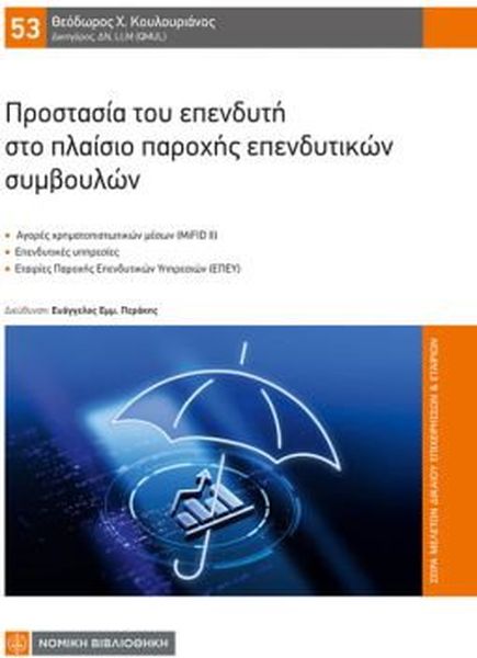 ISBN: 978-618-08-0802-5 Συγγραφέας: ΚΟΥΛΟΥΡΙΑΝΟΣ ΘΕΟΔΩΡΟΣ Εκδοτικός οίκος: ΝΟΜΙΚΗ ΒΙΒΛΙΟΘΗΚΗ Σελίδες: 264 Διαστάσεις: 17Χ24 Ημερομηνία Έκδοσης: Νοέμβριος 2025 Το έργο σχετίζεται με την ευρύτερη θεματική της προστασίας του επενδυτή ως αποδέκτη επενδυτικών υπηρεσιών, και ειδικότερα ως λήπτη επενδυτικών συμβουλών. Την παρούσα μελέτη απασχολεί η δογματική επεξεργασία του πλαισίου που διέπει την παροχή επενδυτικών συμβουλών και κατ επέκταση το μέτρο προστασίας των ιδιωτών επενδυτών. Το επίκεντρο της έρευνας εντοπίζεται στη διερεύνηση των ρυθμίσεων της κείμενης νομοθεσίας σχετικά με τις υποχρεώσεις δεοντολογικής συμπεριφοράς, οι οποίες οριοθετούν το πλαίσιο εντός του οποίου οφείλει να κινηθεί ο πάροχος επενδυτικών συμβουλών και αποτελούν τον ακρογωνιαίο λίθο της προστασίας του επενδυτή. Στο πλαίσιο αυτό, αντικείμενο της μελέτης είναι οι υποχρεώσεις που βαρύνουν την ΕΠΕΥ κατά την παροχή επενδυτικών συμβουλών με βάση το Ν 4514/2018, ο οποίος ενσωμάτωσε στην ελληνική έννομη τάξη την Οδηγία 2014/65/ΕΕ για τις αγορές χρηματοπιστωτικών μέσων (MiFID II), καθώς και οι έννομες συνέπειες, που επέρχονται σε περίπτωση παράβασης των υποχρεώσεων αυτών. Το έργο απευθύνεται σε επιστήμονες που ασχολούνται με το εμπορικό δίκαιο (ιδίως το δίκαιο της κεφαλαιαγοράς) και το αστικό δίκαιο, σε δικαστές, δικηγόρους και νομικούς συμβούλους ΕΠΕΥ και τραπεζών.