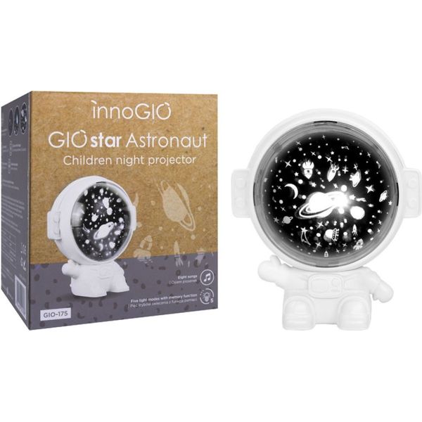 Ο GIOstar Astronaut της INNOGIO είναι ένας προτζέκτορας σε σχήμα αστροναύτη, με διασκεδαστικές φιγούρες διαστήματος και ωκεανού. Με πέντε απαλά νανουρίσματα και εναλλάξιμα slides είναι ιδανικός για να ψυχαγωγεί και να ηρεμεί τα παιδιά, προσφέροντας μαγικές προβολές και φανταστική εξερεύνηση.
