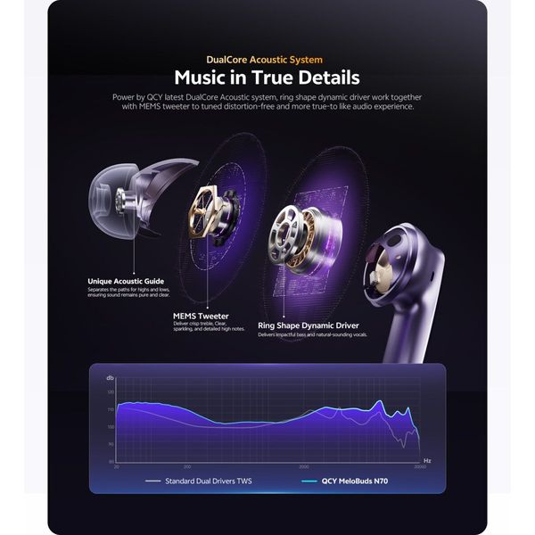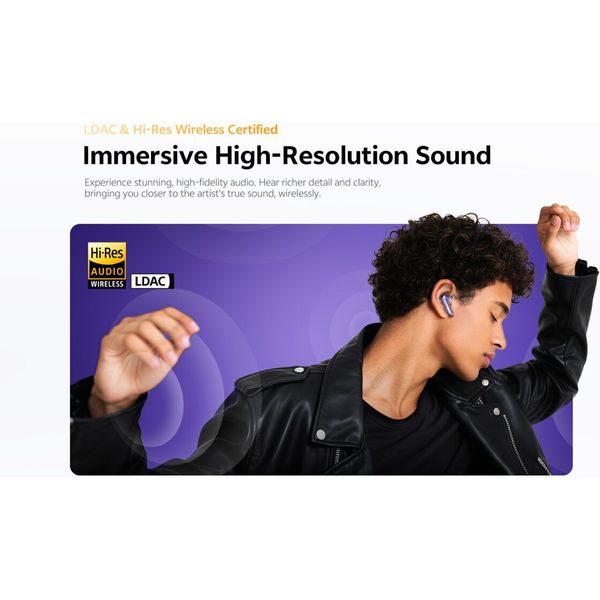 Τα MeloBuds N70 διαθέτουν διπλή αρχιτεκτονική ήχου με δυναμικό driver και MEMS tweeter, προσφέροντας πλούσια μπάσα, καθαρά μεσαία και κρυστάλλινες υψηλές συχνότητες. Με υποστήριξη LDAC και πιστοποίηση Hi-Res Wireless, αποδίδουν τριπλάσια λεπτομέρεια σε σχέση με το συμβατικό Bluetooth audio.