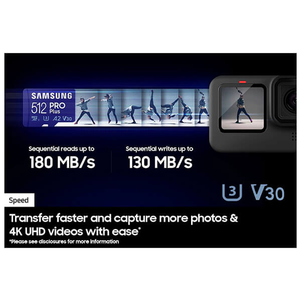 Απόδοση και αξιοπιστία στην οποία μπορείτε να βασίζεστε με τη μνήμη flash Samsung PRO Plus. -Οι υπερφορτισμένες ταχύτητες εγγραφής και η αξιόπιστη απόδοση σάς επιτρέπουν να τραβάτε απρόσκοπτα βίντεο 4K στο συμβατό σας τηλέφωνο ή drone, ενώ ο εκτεταμένος αποθηκευτικός χώρος σάς δίνει την ελευθερία να παίζετε πιο υψηλής απόδοσης, εντατικά παιχνίδια στο tablet ή στη συσκευή παιχνιδιού σας. -Εκπληκτικά γρήγορο U3, ταχύτητες ανάγνωσης/εγγραφής βαθμολογικής κατηγορίας 10, σάς επιτρέπουν να τραβάτε περισσότερες φωτογραφίες πιο γρήγορα και να μεταφέρετε με ευκολία. Τα βίντεο 4K φαίνονται πιο ευκρινή με UHS-I, ονομαστική ταχύτητα V30 και αξιολόγηση A2, που παρέχει περισσότερο χώρο αποθήκευσης για εφαρμογές και παιχνίδια. -Η τεράστια χωρητικότητα των 256 GB σάς προσφέρει άφθονο αποθηκευτικό χώρο. Τραβήξτε όσες μεγάλες λήψεις και φωτογραφίες υψηλής ανάλυσης7 θέλετε ή φορτώστε τις εφαρμογές και τα πολυμέσα που πρέπει να έχετε. -Είστε πλήρως προστατευμένοι. Η PRO Plus παρέχει προστασία από νερό, θερμοκρασία, ακτίνες Χ, μαγνήτες και προστασία φθοράς. Οι εμπειρίες σας είναι αναντικατάστατες και αξίζει αξιόπιστη αποθήκευση, που υποστηρίζεται από περιορισμένη εγγύηση 10 ετών.