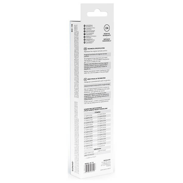 Το τηλεχειριστήριο γενικής χρήσης τηλεόρασης Phillips RC-16 αντικαθιστά το αρχικό τηλεχειριστήριο. Διακρίνεται από την ευκολία χρήσης, τη γενική διάταξη κουμπιών και την ευνοϊκή τιμή. Αυτή η συσκευή τηλεχειρισμού έχει σχεδιαστεί για να λειτουργεί μια ηλεκτρονική συσκευή Phillips. Είναι μια εξαιρετική εναλλακτική λύση στα αυθεντικά τηλεχειριστήρια όταν αποτυγχάνουν. Το τηλεχειριστήριο γενικής χρήσης RC-16 είναι εξοπλισμένο με κουμπιά που σας επιτρέπουν να ελέγχετε τις πιο σημαντικές λειτουργίες της τηλεόρασης Phillips, όπως τη ρύθμιση της έντασης ήχου ή την αλλαγή καναλιών.