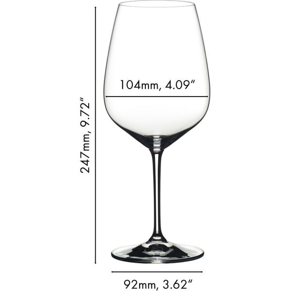 Το ποτήρι Cabernet από τη σειρά Extreme της Riedel είναι τέλειο για πολύπλοκα ερυθρά κρασιά με υψηλή περιεκτικότητα σε ταννίνες. Το σχήμα διαμαντιού λειτουργεί όμορφα για μεγάλα και τολμηρά κρασιά του "Νέου Κόσμου" καθώς οι έντονες γωνίες προσφέρουν περισσότερο χώρο για την ανάπτυξη των αρωμάτων. Το γενναιόδωρο μέγεθος αυτού του ποτηριού δίνει έμφαση στο φρούτο, λειαίνει τις έντονες νότες και τις πικρές ιδιότητες της ταννίνης και επιτρέπει στα κρασιά να επιτύχουν την πολυπόθητη ισορροπία.