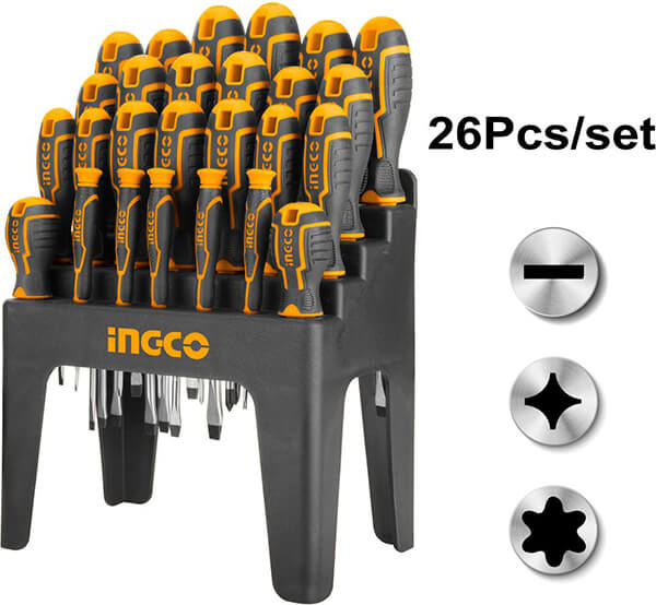 Κατσαβίδια σε Σταντ Σετ 26 τεμ. -11 τεμ. Ίσια SL6 x 38, SL3 x 75, SL4 x 100, SL5.5 x 75, SL5.5 x 100, SL5.5 x 125, SL6.5 x 100, SL6.5 x 125, SL6.5 x 150, SL6.5 x 150, SL8 x 150. -10 τεμ. Σταυρού PH2 x 38, PH0 x 60, PH0 x 75, PH1 x 80, PH1 x 100, PH1 x 125, PH2 x 100, PH2 x 125, PH2 x 150, PH3 x 150. -5 τεμ. Ακριβείας SL2.0 x 50, SL3.0 x 50, PH000 x 50, PH00 x 50, T8 x 50. -Πλαστική βάση (μπαίνει στον τοίχο).