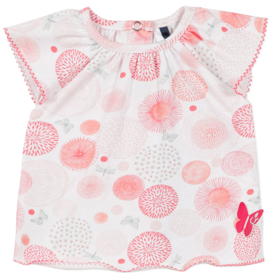 • Κοντομάνικη μπλούζα με στρογγυλή λαιμόκοψη που ανοίγει στο κάτω μέρος.