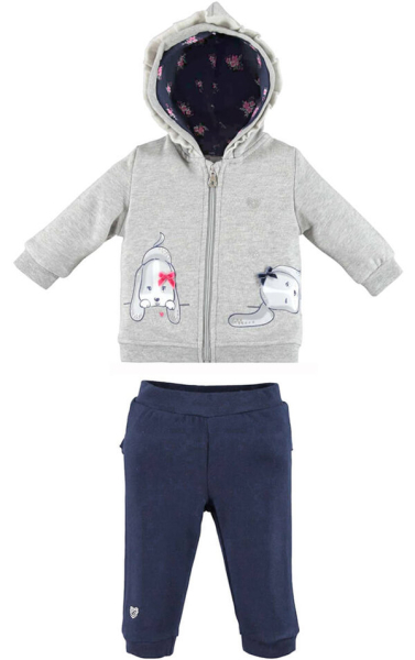 • Ένα φούτερ σε γκρι μελανζέ χρώμα, με στάμπες στο μπροστινό μέρος που απεικονίζουν σκυλάκια, διακοσμημένα με φιογκάκια και διακριτικά στρας.