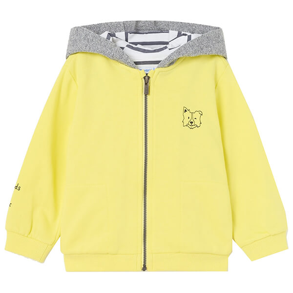 • Η ζακέτα είναι κίτρινο χρώμα με γκρι κουκούλα, δένει στο μπροστινό μέρος με φερμουάρ και διαθέτει ελαστικές μανσέτες στα μανίκια και στο κάτω μέρος.