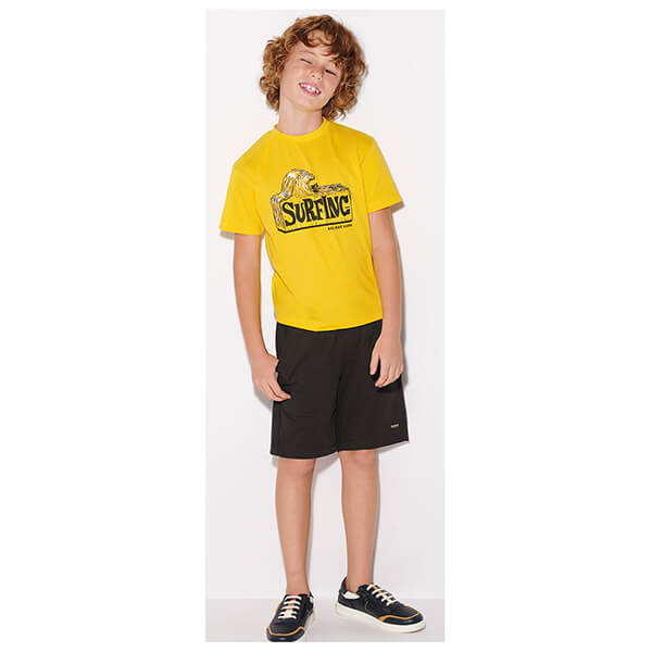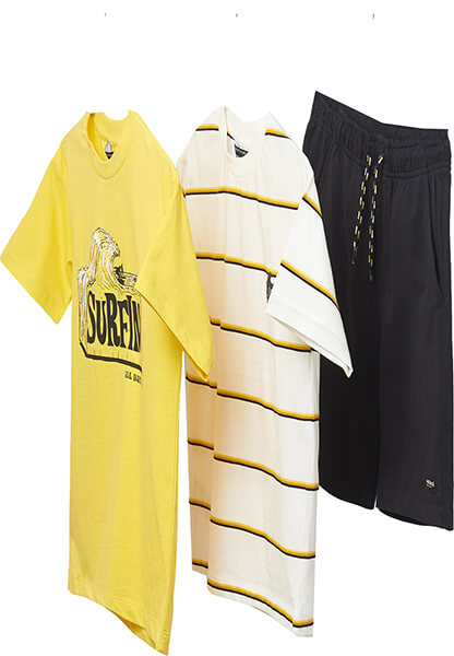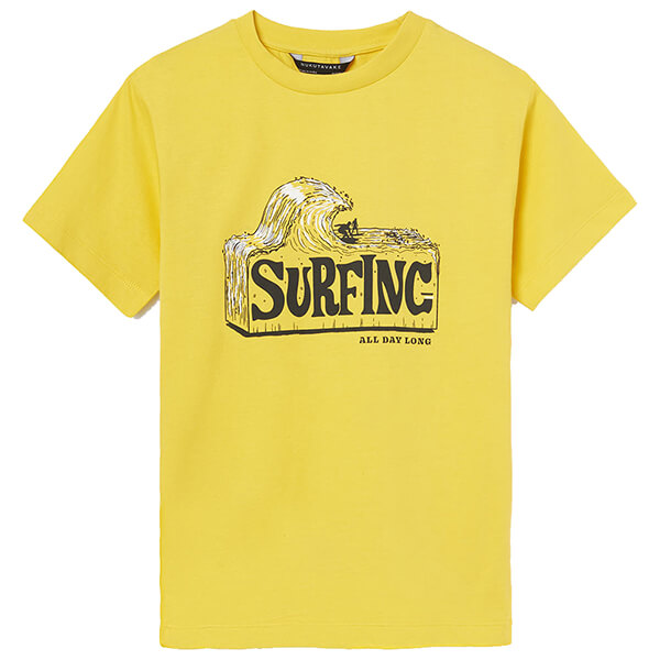 • Η μία μπλούζα είναι σε κίτρινο χρώμα και είναι διακοσμημένη με στάμπα εξαιρετικής ποιότητας όπου απεικονίζεται ένα κύμα και οι λέξεις