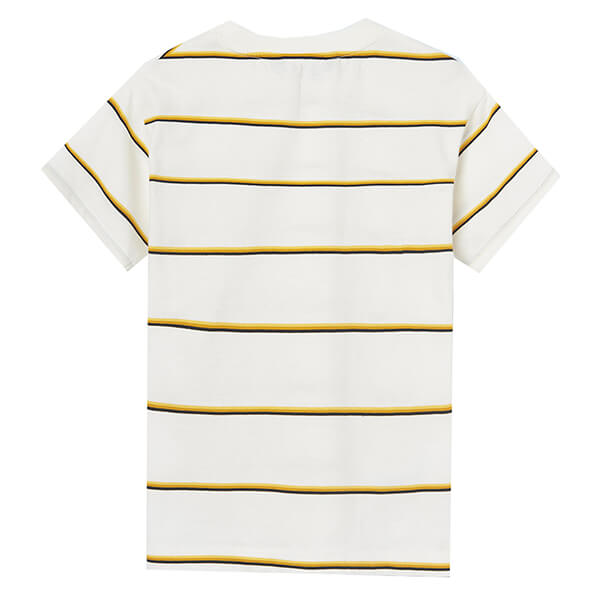 • Η άλλη μπλούζα είναι σε χρώμα λευκό και είναι διακοσμημένη σε όλη της την επιφάνεια με μοτίβο από ρίγες σε κίτρινο, καφέ και μαύρο χρώμα.