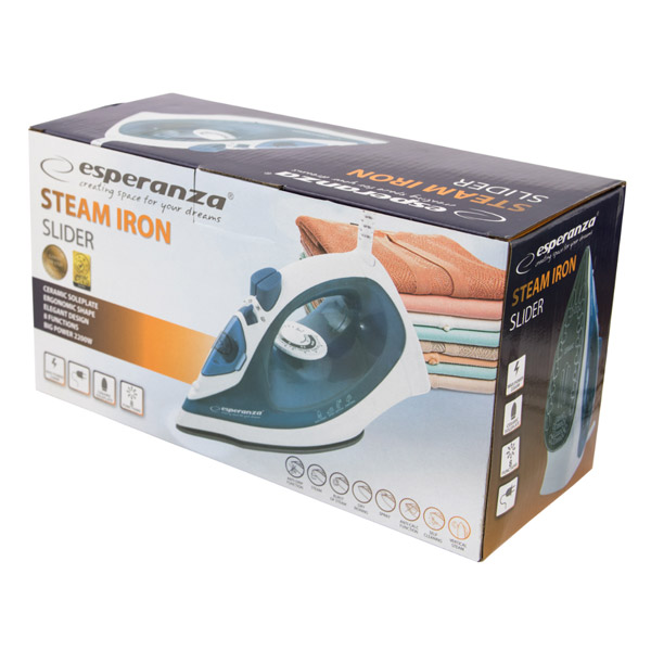 Το σίδερο ατμού Esperanza SLIDER θα λειτουργεί τέλεια σε κάθε νοικοκυριό. Είναι εξοπλισμένο με χαρακτηριστικά όπως: βολή ατμού ή λειτουργία κατά του στάγματος κατά το σιδέρωμα σε χαμηλότερες θερμοκρασίες. Η κεραμική πλάκα του δεν κολλάει και πηγαίνει ομαλά κατά μήκος οποιουδήποτε υλικού. Η ομοιόμορφα κατανεμημένη θερμότητα (σε όλη την πλάκα) και η υψηλή ισχύς (2200W) θα επιταχύνουν σημαντικά το σιδέρωμα. Ο εργονομικός σχεδιασμός και το μικρό του βάρος θα κάνουν το σιδέρωμα εύκολο και ευχάριστο.