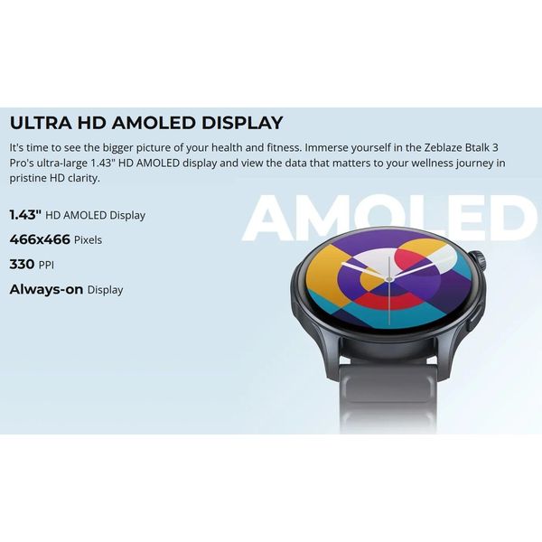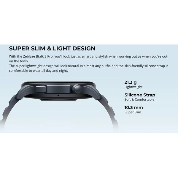 • Μοντέλο: Zeblaze Btalk 3 Pro. • Λειτουργία: Τηλεφωνικές κλήσεις. • Bluetooth: BLE 5.2. • Συμβατότητα: Android 4.4.0 ή iOS 8.0 και νεότερη έκδοση. • Oθόνη: Μεγάλη έγχρωμη οθόνη Ultra HD AMOLED αφής 1, 43'' • Ανάλυση: 466x466 pixel, 326 PPI Έως 1000 nit, Γυαλί Corning Gorilla. • Αισθητήρες: Παρακολούθηση καρδιακού παλμού, οθόνη κορεσμού οξυγόνου αίματος Pulse Ox, Αισθητήρας εγγύτητας, Επιταχυνσιόμετρο. • Μπαταρία: Li-Pol 260 mAh. • Τυπικοί τρόποι χρήσης: Έως 14 ημέρες. • Λειτουργίες βαριάς χρήσης: Έως 7 ημέρες. • Συνεχής Φωνητική Κλήση: Έως 365 λεπτά. • Χρόνος φόρτισης: Περίπου 1, 5 ώρα. • Πλάτος λουριού σιλικόνης: 22 mm, συμβατό με τυπικά λουράκια ρολογιών ταχείας αποδέσμευσης 22 mm. • Περιφέρεια καρπού: 145-220 mm. • Διαστάσεις: 46, 6 x 45, 2 x 10, 3 mm. • Βάρος με λουρί: 38, 6 gr. • Bάρος χωρίς λουρί: 21, 3 γρ. • θερμοκρασία λειτουργίας: -20°C. • Θερμοκρασία λειτουργίας μέγιστη: 40°C. • Αντοχή στο νερό: IP68. • Περιεχόμενα: Smartwatch, Λουράκι σιλικόνης, Καλώδιο φόρτισης, Εγχειρίδιο οδηγιών. • Χρώμα: Σκούρο γκρι - μαύρο. • Εγγύηση: 2 Χρόνια. DOA 7 ημερών