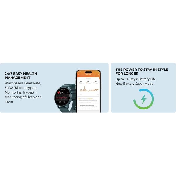 Ήρθε η ώρα να δείτε τη μεγαλύτερη εικόνα της υγείας και της φυσικής σας κατάστασης. Βυθιστείτε στην εξαιρετικά μεγάλη οθόνη HD AMOLED 1,43" του Zeblaze Btalk 3 Pro και δείτε τα δεδομένα που έχουν σημασία για το ταξίδι ευεξίας σας με εξαιρετική ευκρίνεια HD. Με το Zeblaze Btalk 3 Pro, θα φαίνεστε εξίσου έξυπνοι και κομψοί όταν γυμνάζεστε όπως όταν είστε έξω στην πόλη. Ο εξαιρετικά ελαφρύς σχεδιασμός θα φαίνεται φυσικός σχεδόν σε κάθε ντύσιμο και το φιλικό προς το δέρμα λουράκι σιλικόνης είναι άνετο για χρήση όλη μέρα και νύχτα. Με τυπική χρήση, η μεγάλη διάρκεια ζωής της μπαταρίας του Zeblaze Btalk 3 Pro μπορεί να διαρκέσει έως και 14 ημέρες, ώστε να μπορείτε να ετοιμάζετε την τσάντα σας με πιο διασκεδαστικά πράγματα και λιγότερους φορτιστές. Ξεκινήστε ένα ταξίδι για βελτιωμένη ευεξία με το Zeblaze Btalk 3 Pro, τον ολοκληρωμένο σύντροφό σας για υγεία και φυσική κατάσταση. Αυτό το έξυπνο ρολόι προσφέρει εις βάθος παρακολούθηση του καρδιακού σας παλμού, των επιπέδων οξυγόνου στο αίμα, των προτύπων ύπνου και της παρακολούθησης της υγείας των γυναικών και των ασκήσεων αναπνοής. Η σημερινή λειτουργία δεδομένων επεκτείνει τις δυνατότητές της ώστε να περιλαμβάνει παρακολούθηση ολοήμερης δραστηριότητας, λήψη βημάτων, απόστασης, θερμίδων που καίγονται και ενεργών λεπτών. Μαζί, αυτά τα χαρακτηριστικά παρέχουν μια ολιστική επισκόπηση της υγείας σας, δίνοντάς σας τη δυνατότητα να λαμβάνετε τεκμηριωμένες αποφάσεις και να παραμένετε παρακινημένοι για την επίτευξη των στόχων φυσικής κατάστασης. Ανεβάστε την ημέρα σας με το Zeblaze Btalk 3 Pro, τον απόλυτο προσωπικό βοηθό στον καρπό σας. Απαντήστε απρόσκοπτα σε εισερχόμενες ή εξερχόμενες κλήσεις μέσω μιας σύνδεσης Bluetooth στο smartphone σας, διασφαλίζοντας ότι παραμένετε συνδεδεμένοι χωρίς να τραβάτε το τηλέφωνό σας. Με τον ενσωματωμένο φωνητικό βοηθό, η διαχείριση του προγράμματός σας, η ρύθμιση υπενθυμίσεων ή η εκτέλεση εντολών γίνεται αβίαστα αποτελεσματική, επιτρέποντάς σας να εστιάσετε σε ό,τι έχει μεγαλύτερη σημασία. Είτε στη μέση μιας προπόνησης είτε στο τρέξιμο, το Zeblaze Btalk 3 Pro έχει σχεδιαστεί για να βελτιώνει την παραγωγικότητα και τη συνδεσιμότητα σας, κάνοντας κάθε εργασία πιο ομαλή και πιο προσιτή.