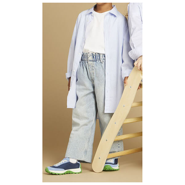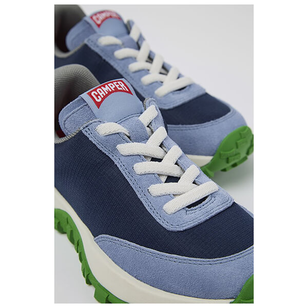 Χαμηλά παπούτσια, τύπου sneakers, από τη σειρά Drift Trail της Camper σε μπλε χρώμα, με γαλάζιες, λευκές και πράσινες λεπτομέρειες. Πρόκειται για κομψά και άνετα παπούτσια κατασκευασμένα εξωτερικά από μαλακό δέρμα και ανακυκλωμένο πολυεστέρα. Έχουν αφαιρούμενο πάτο PU ενώ η εξωτερική τους σόλα έχει αντιολισθητική επιφάνεια και είναι κατασκευασμένη από καουτσούκ. Κλείνουν με ελαστικά κορδόνια. Στη γλώσσα υπάρχει patch με το logo της Camper Το Drift Trail είναι ένα καθημερινό παπούτσι με έμπνευση από τα '70s της συλλογής για ενηλίκους, προσαρμοσμένο για τα μικρά ποδαράκια.