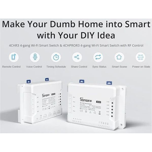 Sonoff 4CH PRO R3 Smart Ενδιάμεσος Διακόπτης με Wi-F σε Λευκό Χρώμα. -Το 4CH R3 της Sonoff είναι ένας ασύρματος έξυπνος διακόπτης Wi-Fi 4 καναλιών, που έχει σχεδιαστεί για να σας δώσει τη δυνατότητα να δημιουργήσετε ένα έξυπνο σπίτι και να αποκτήσετε τον απόλυτο έλεγχό του. -Mπορεί να χρησιμοποιηθεί για τον έλεγχο των φώτων και άλλων οικιακών συσκευών ταυτόχρονα σε τέσσερις περιοχές του σπιτιού σας. Προγραμματίστε τον χρονοδιακόπτη, ώστε οι συσκευές σας να λειτουργούν αυτόματα. -Προσαρμόστε τα δικά σας έξυπνα σκηνικά σύμφωνα με τις επιλογές σας και μοιραστείτε την άδεια ελέγχου των συσκευών σας και με άλλους λογαριασμούς για κοινή χρήση απ' όλη την οικογένεια. -Οι χρήστες μπορούν να λειτουργούν εξ αποστάσεως τις συνδεδεμένες συσκευές μέσω της δωρεάν εφαρμογής eWeLink που διατίθεται σε πλατφόρμες iOS και Android. -Η φωνητική υποστήριξη και η συνεργασία με έξυπνους βοηθούς είναι επίσης δυνατή μέσω της συμβατότητας με Amazon Alexa, Amazon Echo, Echo Dot, Amazon Tap, Google Assistant, Google Home, Google Nest, IFTTT. -Ο έξυπνος διακόπτης 4CH R3 της Sonoff είναι κατασκευασμένος με εξαιρετικά υλικά, ενώ το περίβλημα διαθέτει υψηλής ποιότητας πυρίμαχο υλικό, που προσφέρει προστασία και ασφάλεια κατά την χρήση του. -Είναι συμβατός με τις πολλές συσκευές, όπως συσκευές φωτισμού, ανεμιστήρες, οικιακές συσκευές, πόρτες γκαράζ και πολλά άλλα. Συνδεσιμότητα: Wi-Fi.Συμβατότητα: Alexa & Google Home.Τροφοδοσία: 100-240V AC 50/60HzMax. Load: 10A/2200W/Gang 16A/3500W/TotalΘερμοκρασία λειτουργίας: -10?C έως 40?C.Υγρασία λειτουργίας: 5%-95%RH.Πιστοποίηση: FCC/CE.Βάρος: 100 g.Διαστάσεις: 145 x 90 x 34 mm.Χρώμα: Λευκό.Εγγύηση: 2 χρόνια. DOA 7 ημερών