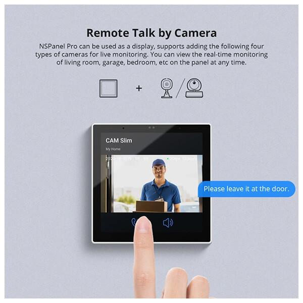 Ο διακόπτης είναι εξοπλισμένος με οθόνη και λειτουργεί με κάμερες Sonoff (CAM Slim, GK-200MP-B), RTSP και ESP32. Έτσι, θα τις αντιστοιχίσετε με τη συσκευή, αποκτώντας εικόνα του γκαράζ, της τραπεζαρίας ή της εισόδου του σπιτιού σας. Επιπλέον, υποστηρίζει αμφίδρομο ήχο, ώστε να μπορείτε να επικοινωνείτε άνετα με έναν κούριερ, για παράδειγμα. Επιπλέον, διαθέτει ενσωματωμένο μικρόφωνο και ηχείο - όταν συνδέεται με smartphone ή διακόπτη, έτσι σας επιτρέπει να επικοινωνείτε με άλλους