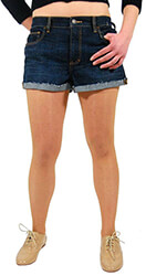 Κοντό σορτσάκι jeans, σε σκούρο μπλε χρώμα, με πεντε τσέπες και γυρισμένο ρεβέρ με ξέφτια στο φινίρισμα.