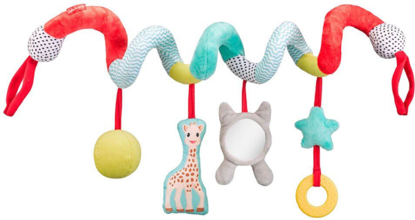 Λαμπερά χρώματα και σχέδια για να ενισχύσουν την αίσθηση της αφής, μια μπαλίτσα που κουδουνίζει, η Σόφι που βγάζει ήχο χαρτιού που τσαλακώνει, ένας μαλακό δαχτύλιος οδοντοφυϊας και ένας καθρέπτης!!!