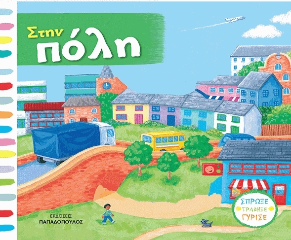 Ένα βιβλίο με γερές χαρτονένιες λαβές και κινούμενες ροδέλες, που ζωντανεύει στα χεράκια των μικρών παιδιών και τα βοηθά να μάθουν τι γίνεται μέσα σε μια πόλη.