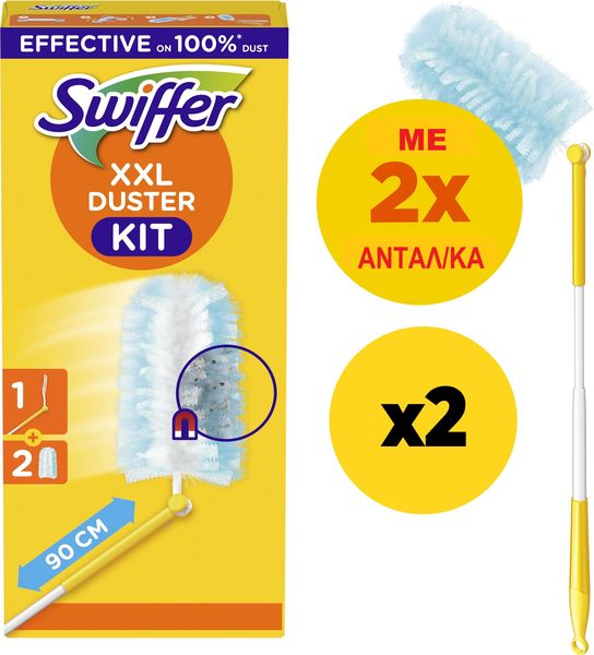 Το Swiffer Duster Kit XXL είναι η ιδανική επιλογή για γρήγορο και αποτελεσματικό ξεσκόνισμα στο σπίτι. Η μεγάλη λαβή καθώς και τα δύο πανάκια που περιλαμβάνονται, επιτρέπουν να φτάσετε με άνεση σε υψηλές, χαμηλές ή δύσκολα προσβάσιμες επιφάνειες. Οι ειδικές ίνες των πανιών «πιάνουν» τη σκόνη, τις τρίχες και ακάρεα, χωρίς να αφήνουν ίχνη ή να σκορπίζουν ρύπους.