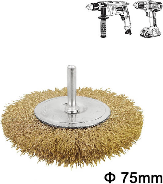 Συρματόβουρτσα με ’ξονα για Δράπανο 75mm. Υψηλής ποιότητας ορειχάλκινο σύρμα για εργασίες λείανσης σιδήρου.