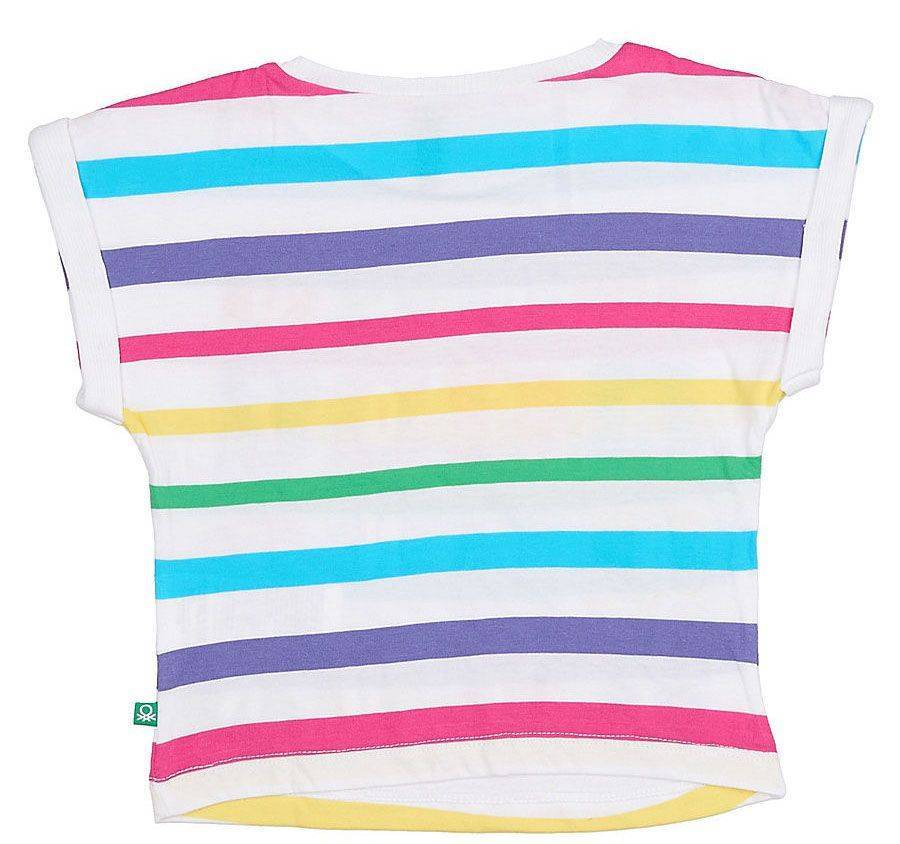 T-shirt με την υπογραφή της εταιρείας Benetton. Είναι κοντομάνικο με κανονική εφαρμογή και στρογγυλή λαιμόκοψη. Στο μπροστινό μέρος διαθέτει στάμπα εξαιρετικής ποιότητας και ριγέ μοτίβο σε όλη του την επιφάνεια. Company info