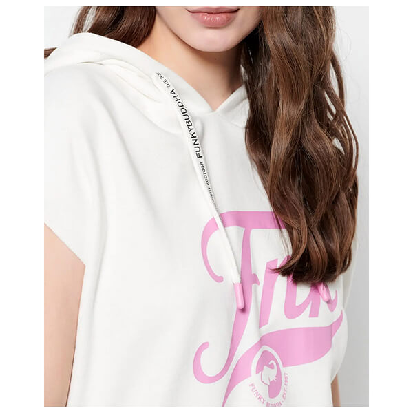 Έχει κανονική εφαρμογή, στρογγυλή λαιμόκοψη, κοντά μανίκια και κουκούλα με κορδόνι περίσφιξης.
