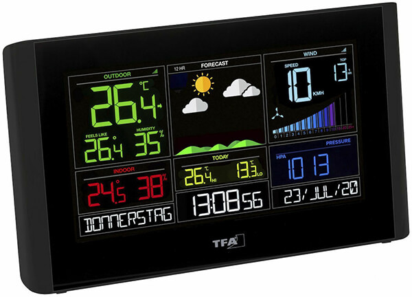 Μετεωρολογικός σταθμός TFA ο οποίος αποτελεί το κατάλληλο εργαλείο ώστε να είστε πάντα ενήμεροι και προετοιμασμένοι για τις καιρικές συνθήκες. -Ο σταθμός διαθέτει δύο εξωτερικούς πομπούς: ένας θερμο-υγροπομπός ελέγχει την εξωτερική θερμοκρασία και την υγρασία και ένα ανεμόμετρο καθορίζει την ταχύτητα του ανέμου στο σημείο εγκατάστασης. Τα δεδομένα αποστέλλονται στο σταθμό βάσης σε εμβέλεια έως και 100 m (στο ύπαιθρο). -Ένα ενσωματωμένο ηλεκτρονικό βαρόμετρο μετρά την πίεση του αέρα και η έγχρωμη εικόνα του καιρού δίνει μια πρόβλεψη για τον επερχόμενο καιρό. -Επίσης προσφέρει περαιτέρω πληροφορίες, όπως μέγιστες και ελάχιστες τιμές, την αντιληπτή θερμοκρασία "ψύχους ανέμου", και τις ρυθμίσεις συναγερμού για πολλές παραμέτρους, καθώς και ένα ρολόι με την ημερομηνία και την ημέρα της εβδομάδας. -Μπορείτε να δείτε την πρόβλεψη για τις επόμενες 12 ώρες ή 7 ημέρες ξεχωριστά με το πάτημα ενός κουμπιού. -Εμφανίζονται και άλλες ενδιαφέρουσες καιρικές λεπτομέρειες, όπως οι αναμενόμενες μέγιστες και ελάχιστες θερμοκρασίες και η πιθανότητα βροχής. -Ορίστε όρια συναγερμού και λάβετε ειδοποιήσεις push σε περίπτωση συναγερμού για ενημέρωση. -Μπορούν να συνδεθούν έως και 4 επιπλέον πομποί, π.χ. για έλεγχο θερμοκρασίας και υγρασίας στο παιδικό δωμάτιο ή πομπός πισίνας. -Η έγχρωμη οθόνη υψηλής αντίθεσης μπορεί να ρυθμιστεί σε τρία επίπεδα φωτεινότητας και να μειώνεται αυτόματα τη νύχτα. -Η απεικόνιση των μετρήσεων είναι ψηφιακή, που σημαίνει ότι η συσκευή εμφανίζει αριθμητικά όλες τις ενδείξεις. -Μπορείτε να τον εγκαταστήσετε είτε σε κάποιο έπιπλο, είτε στον τοίχο. Σε κάθε περίπτωση θα πρέπει να τον τοποθετείτε σε σημείο με όσο το δυνατόν πιο ουδέτερες συνθήκες. Χαρακτηριστικά Εξωτερική θερμοκρασία: -40°C - +60°C.Υγρασία: 10 - 99%.Εμβέλεια: 100 m.Εσωτερική θερμοκρασία: 0°C - +50°C.Υλικό: πλαστικό.Τροφοδοσία: Μπαταρίες, μετασχηματιστής AC (βύσμα ΕΕ).Μπαταρίες: 2 x 1,5 V AA (πομπός), 2 x 1.5 VC (ανεμόμετρο), 1 x 3V CR2032 (σταθμός βάσης).Διαστάσεις: 229 x 83 x 137 mm.Βάρος: 377 g.Χρώμα: Μαύρο.Εγγύηση: 2 χρόνια. DOA 7 ημερών