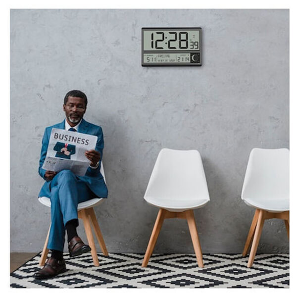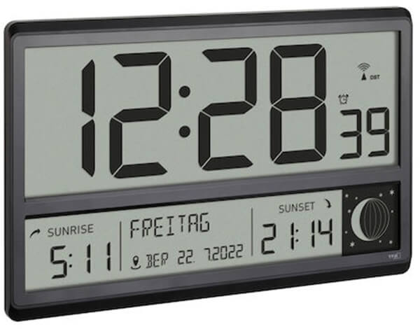 Ένα ρολόι είναι μέρος του βασικού εξοπλισμού για χώρους αναμονής, δεξιώσεις, γραφεία και δημόσια κτίρια. Η μεγάλη, εξαιρετικά καθαρή οθόνη μπορεί επίσης να διαβαστεί από απόσταση. Η ώρα εμφανίζεται σε ιδιαίτερα μεγάλη μορφή και πάντα με ακρίβεια στο δευτερόλεπτο. Η μετάβαση από τη θερινή στη χειμερινή ώρα πραγματοποιείται αυτόματα. Η ημέρα της εβδομάδας γραμμένη πλήρως και η πλήρης ημερομηνία καθιστούν τον προσανατολισμό της ώρας πολύ εύκολο και βολικό. Ως ειδικό χαρακτηριστικό, το ρολόι δείχνει την ώρα για την ανατολή και τη δύση του ηλίου και την τρέχουσα φάση της σελήνης στην τοποθεσία σας. Επιλέξτε την πόλη που βρίσκεται πιο κοντά στο σπίτι σας από 158 ευρωπαϊκές μητροπόλεις. Η απλή και καθαρή σχεδίαση ταιριάζει σε οποιοδήποτε περιβάλλον, ανεξάρτητα από το αν θέλετε να τοποθετήσετε το ραδιοελεγχόμενο ρολόι σε έναν τοίχο ή να το τοποθετήσετε στον πάγκο της λήψης. Επιπλέον, η συσκευή διαθέτει επίσης όλες τις λειτουργίες ενός ξυπνητηριού.
