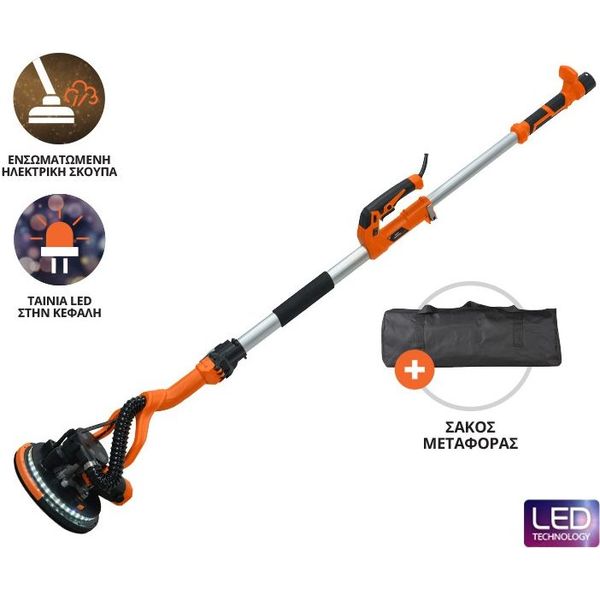 Η διπλή σειρά LED στην κεφαλή φωτίζει τέλεια την επιφάνεια λείανσης, αποκαλύπτοντας ατέλειες και αυξάνοντας την ακρίβεια. Η ενσωματωμένη ηλεκτρική σκούπα με εύκαμπτο σωλήνα 2m απορροφά τη σκόνη αποτελεσματικά κατά την εργασία, μειώνοντας δραστικά τη διασπορά της στον χώρο.