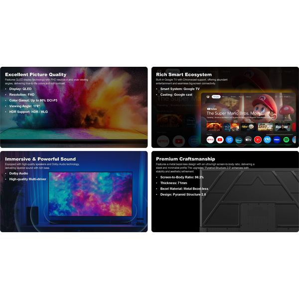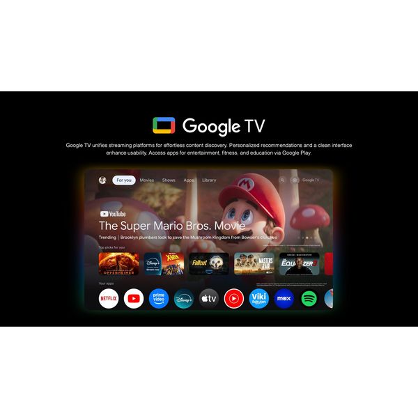 Χάρη στο Google TV, μπορείτε να απολαμβάνετε εύκολη πρόσβαση σε δημοφιλείς πλατφόρμες όπως YouTube, Netflix, Disney+ και Prime Video, ενώ η υποστήριξη φωνητικών εντολών μέσω Google Assistant κάνει την πλοήγηση απλή και διασκεδαστική.