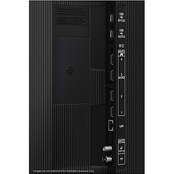 Πλήρης εξοπλισμός συνδεσιμότητας Wi-Fi 5, Bluetooth 5.3, 3 HDMI θύρες, 2 USB-A, Ethernet, CI+ (1.4), HbbTV 2.0.4, και Anynet+ (HDMI-CEC). Σχεδιασμός Slim Look με μαύρο bezel-less πλαίσιο και Flat Feet Narrow βάση.