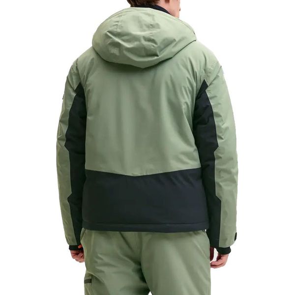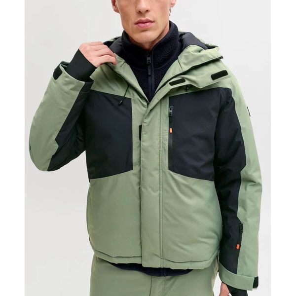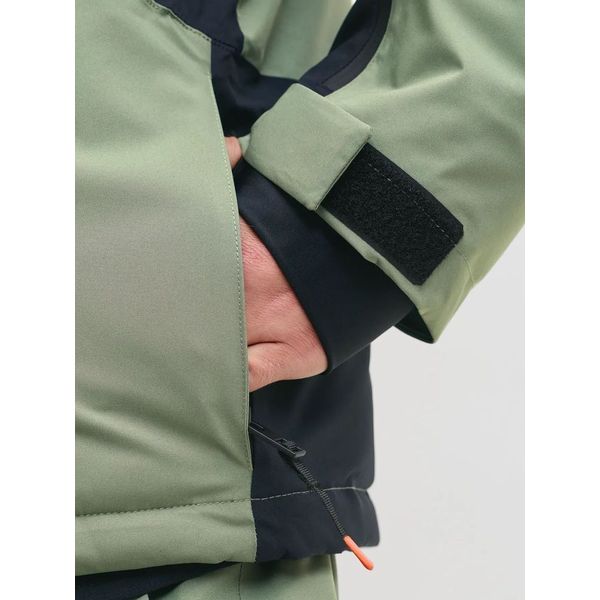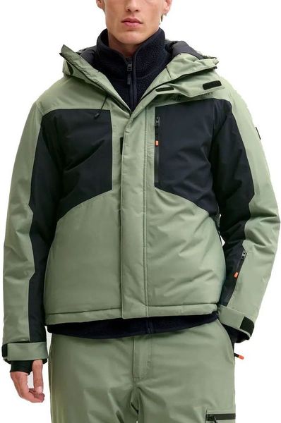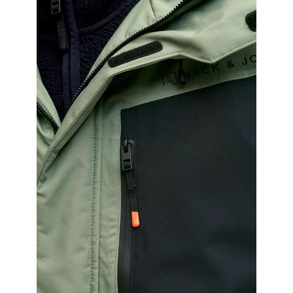 Κλείνει κατά μήκος με φερμουάρ και velcro και έχει ψηλή λαιμόκοψη με κουκούλα με κορδόνι περίσφιξης.