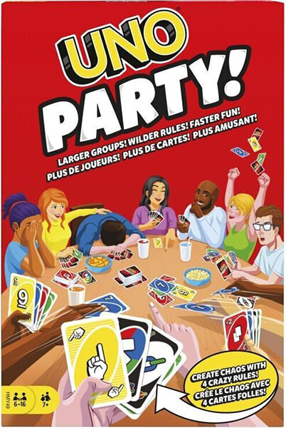 Το κλασικό παιχνίδι UNO, που οι παίκτες γνωρίζουν και αγαπούν, με επιπλέον κάρτες και ειδικούς κανόνες που έχουν σχεδιαστεί ειδικά για μεγάλες ομάδες! Οι κανόνες αυτής της έκδοσης βάζουν τους παίκτες να μοιράζουν κάρτες μέχρι κάποιος να μην μπορεί να παίξει, να δείχνουν με το δάχτυλό τους άλλους παίκτες για να τραβήξουν κάρτες και να συνδέουν δύο παίκτες που πρέπει να τραβήξουν κάρτες ταυτόχρονα. Υπάρχει ακόμα και η ειδική κάρτα δράσης Γρήγορο Παιχνίδι. Σχεδιασμένο για 6 έως 16 παίκτες, το UNO Party είναι ένα διασκεδαστικό παιχνίδι που φέρνει κοντά οικογένειες και φίλους σε διασκεδαστικές βραδιές παιχνιδιών!