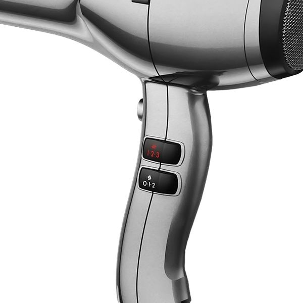 Επαγγελματικό σεσουάρ μαλλιών με AC μοτέρ 2400W και SuperFlex καλώδιο 3 μέτρων, με σύστημα Rotocord για περιστροφή 360°, σε ασημί χρώμα.