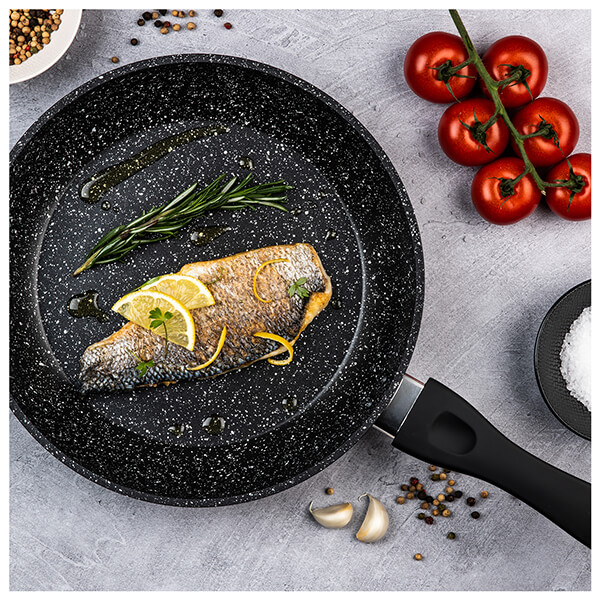 - Διπλή αντικολλητική επίστρωση PFLUON COOKMARK (μαύρο μάρμαρο) για υγιεινό μαγείρεμα, αντοχή στη θερμότητα, ενώ επίσης είναι φιλική προς τον χρήστη και το περιβάλλον.